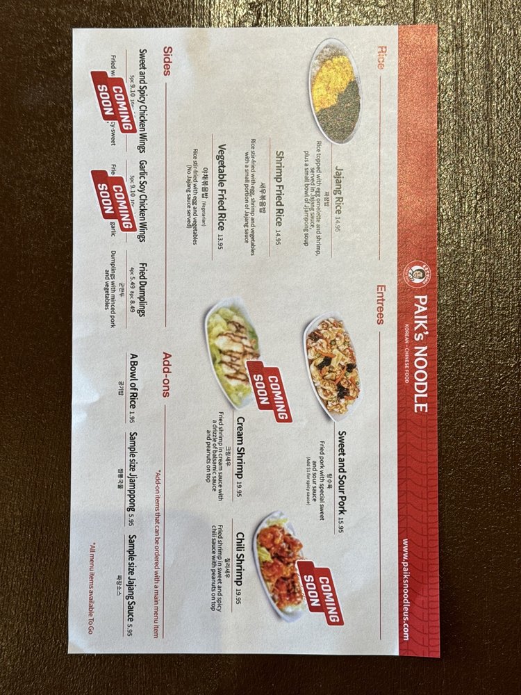 Don't overlook the enticing sides like crispy Garlic Soy Chicken Wings and Fried Dumplings, which round out your meal beautifully. Customers rave about the quality and flavor, making Paik's a must-visit for noodle enthusiasts. Come and experience the heartiness of their dishes and the welcoming ambiance!